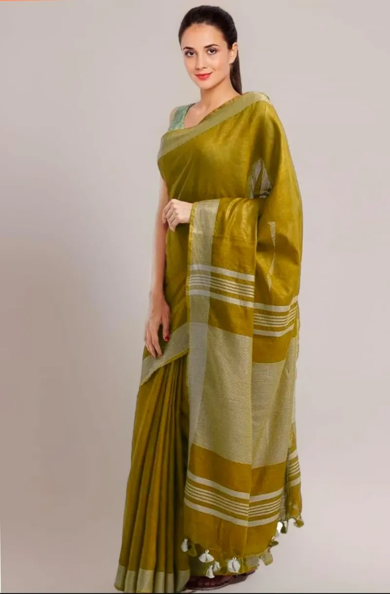 This is a striking plain saree in a rich, earthy olive green or mustard green shade. While the body is simple and unembellished, its beauty lies in the luxurious texture and the elegant drape, suggesting it's made from a high-quality cotton or linen-cotton blend fabric.