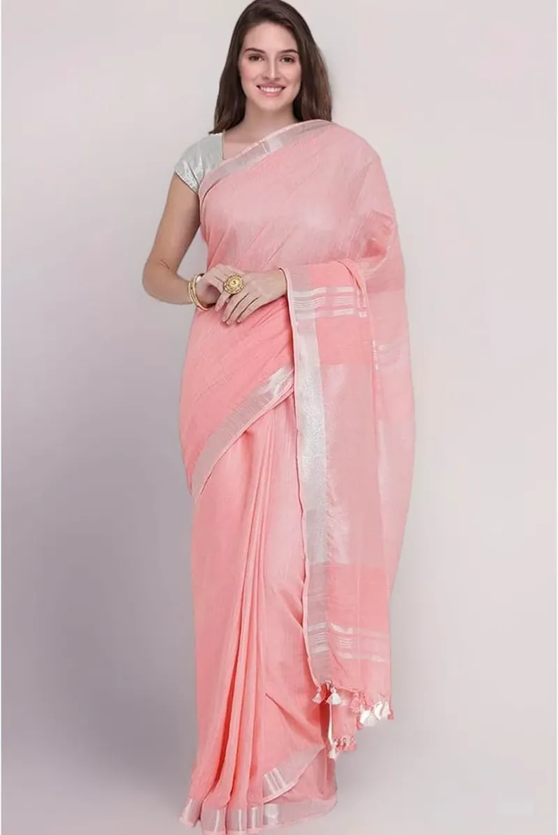 The simplicity of the solid pink body is enhanced by a striking yet subtle silver metallic border (Zari) running along the edges, adding a touch of sophisticated shimmer. The pallu features complementary silver stripes and is finished with charming white tassels, lending a playful and traditional flourish.