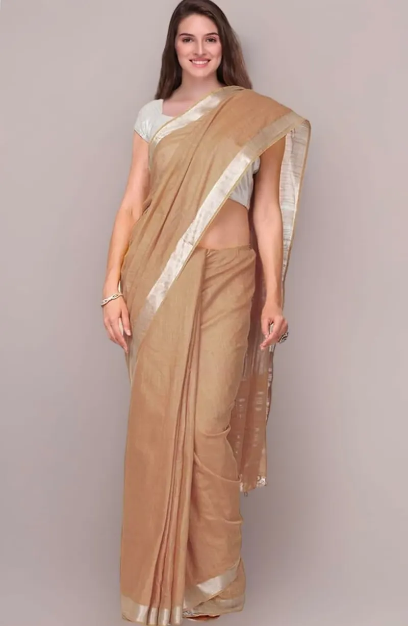 Drape yourself in the subtle elegance of this Beige Tussar Silk Saree. Crafted from luxurious handloom fabric, it features a simple yet striking silver zari border. Perfect for formal day events or a sophisticated evening look.