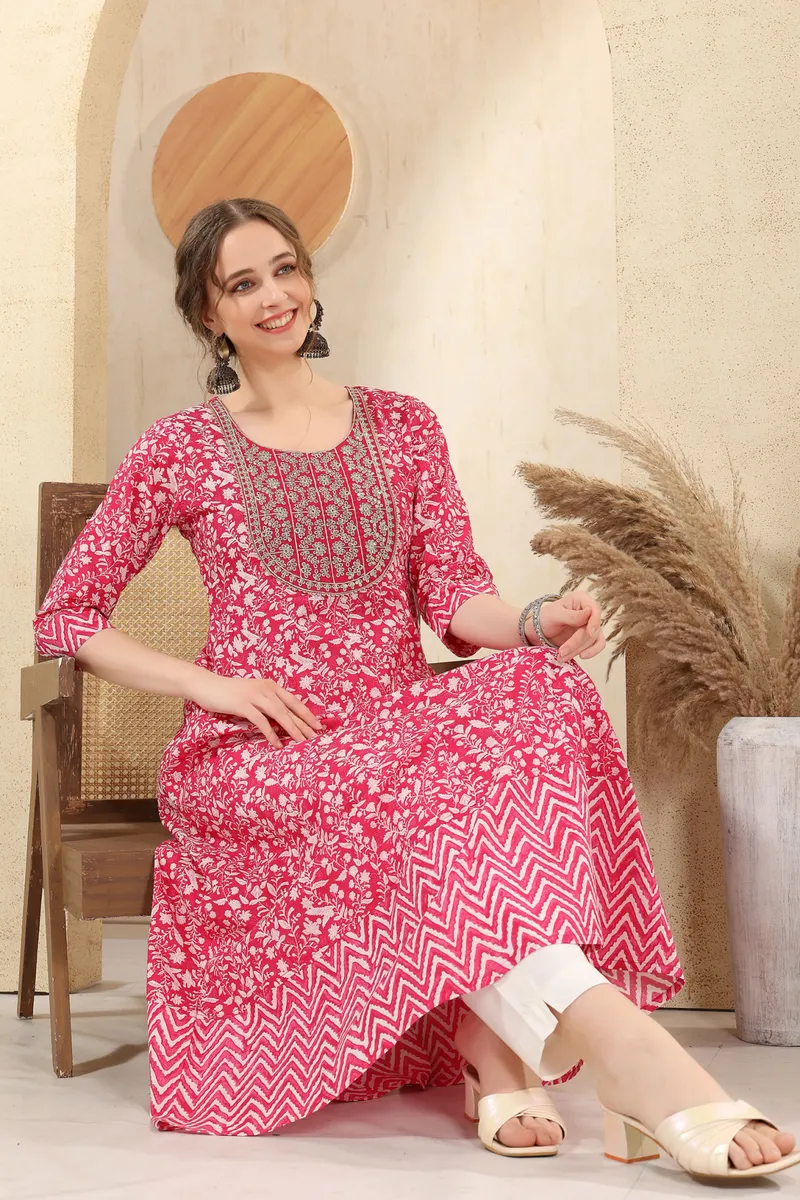 Pink Jaipuri Cotton Print Anarkali For Women With Zari Embroidery Yoke. Round Neck with Zari Embroidery and Beautiful Mix-n-Match print makes it exclusive and party wear.